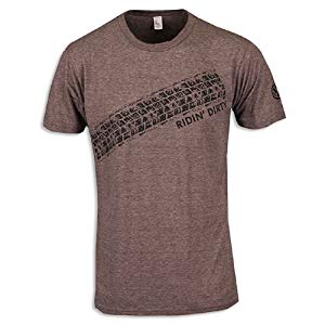Discover the open road in style! This heather brown, ultra lightweight tee is as comfortable as it looks. Features tire tread design screen printed on the front with "Ridin' Dirty" saying underneath. VW logo screen-printed on the left sleeve.